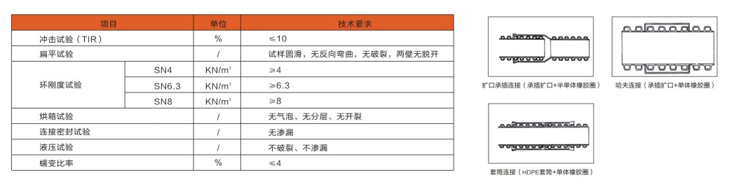 較較(HDPE)具有優(yōu)良的化學(xué)穩(wěn)定性,不易老化及耐環(huán)境應(yīng)力開(kāi)裂的性能。由其為原材料生產(chǎn)出來(lái)的HDPE雙波壁紋管屬于柔性管。其主要特征如下: